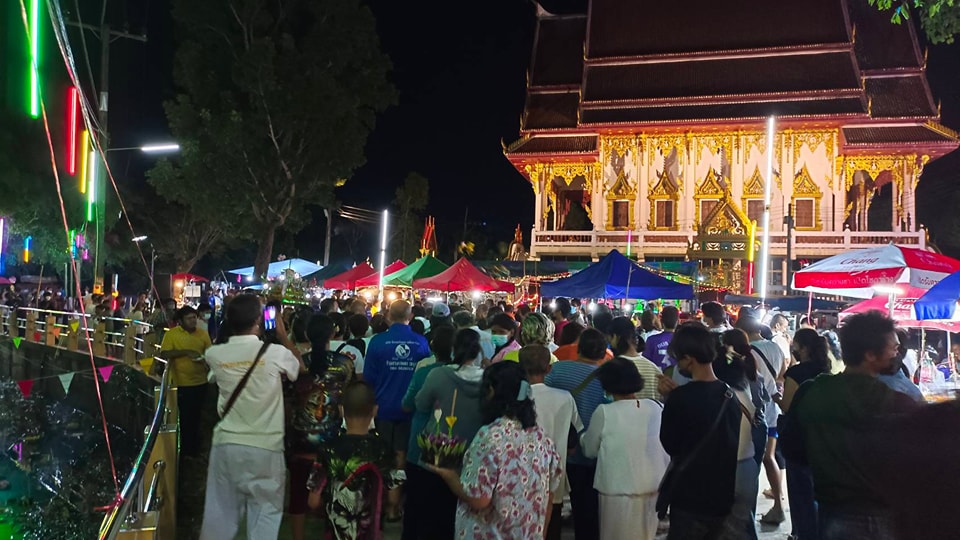 ซึ่งภายในงานมี พ่อค้าแม่ค้าต่างพากันมาตั้งซุ้มร้านค้าชุมชน ทั่วทั้งบริเวณชายหาดกันอย่างแน่นหนา ทั้งอาหารทะเลซีฟู้ด และหมึกย่าง พร้อมกันนี้ยังมีการตกแต่งประดับโคมไฟแขวน และไฟประดับอย่างงดงามตระการตา ตลอดทั้งแนวหาด ส่วนกระทงที่นำมาลอยกัน มีทั้งที่ทำจากวัสดุธรรมชาติ อาหารปลา และกรวยไอศครีม ที่มีสีสันสวยงามแตกต่างกันไป