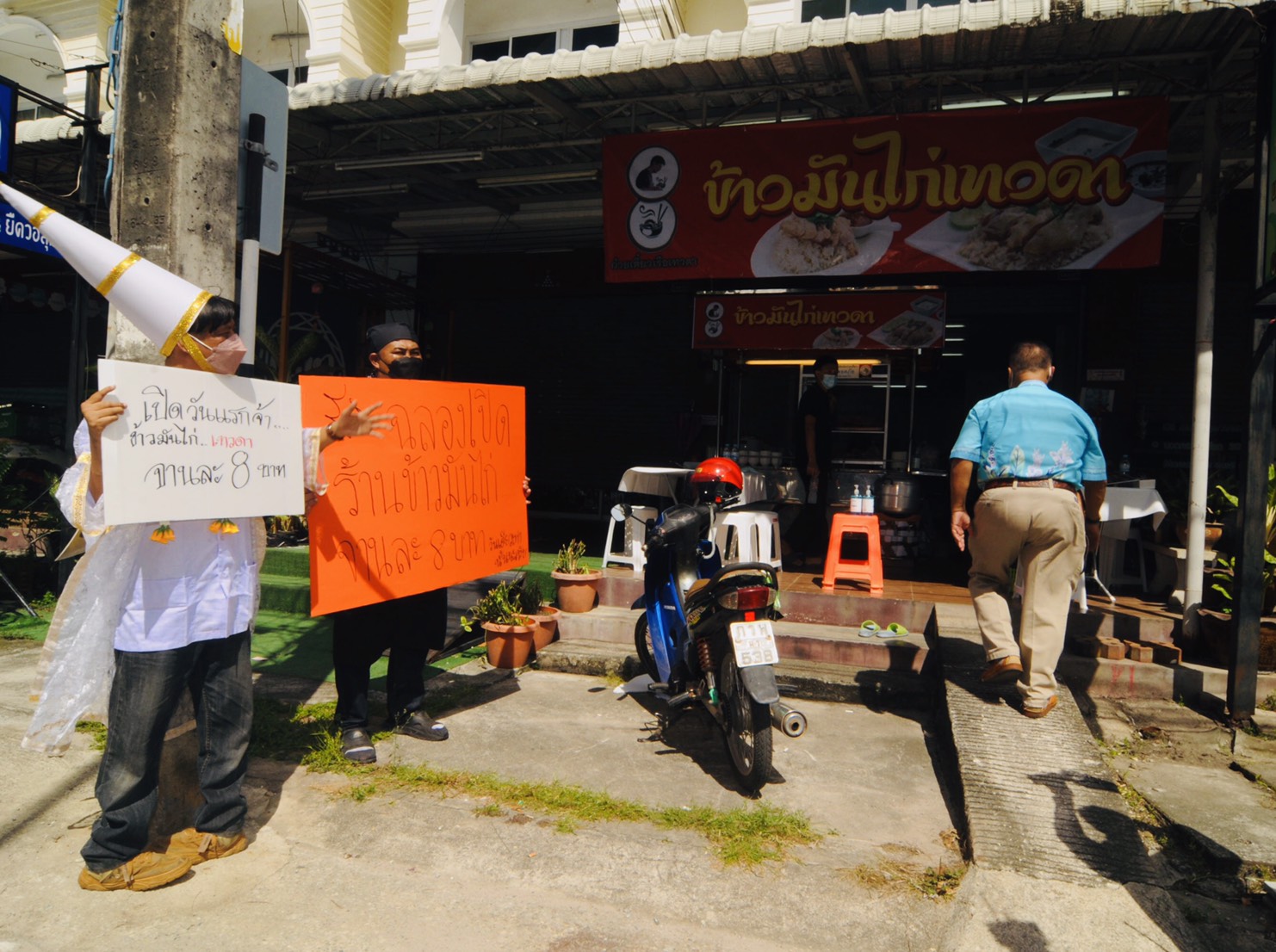 (18 พ.ย.64) เวลา 08.00 น. ผู้สื่อข่าวรายงานว่า ที่บริเวณหน้าร้านข้าวมันไก่เทวดา เลขที่ 144/27 ถนนราษฏร์บำรุง ต.เนินพระ อ.เมือง จ.ระยอง มีชายแต่งชุดคล้ายเทวดายืนโบกรถเรียกลูกค้าอยู่หน้าร้านข้าวมันไก่ ในมือถือป้ายมีข้อความเชิญชวนให้ชิมข้าวมันไก่ราคา 8 บาท ซึ่งเป็นวันแรกของการเปิดร้าน มีลูกค้าให้ความสนใจจำนวนมาก