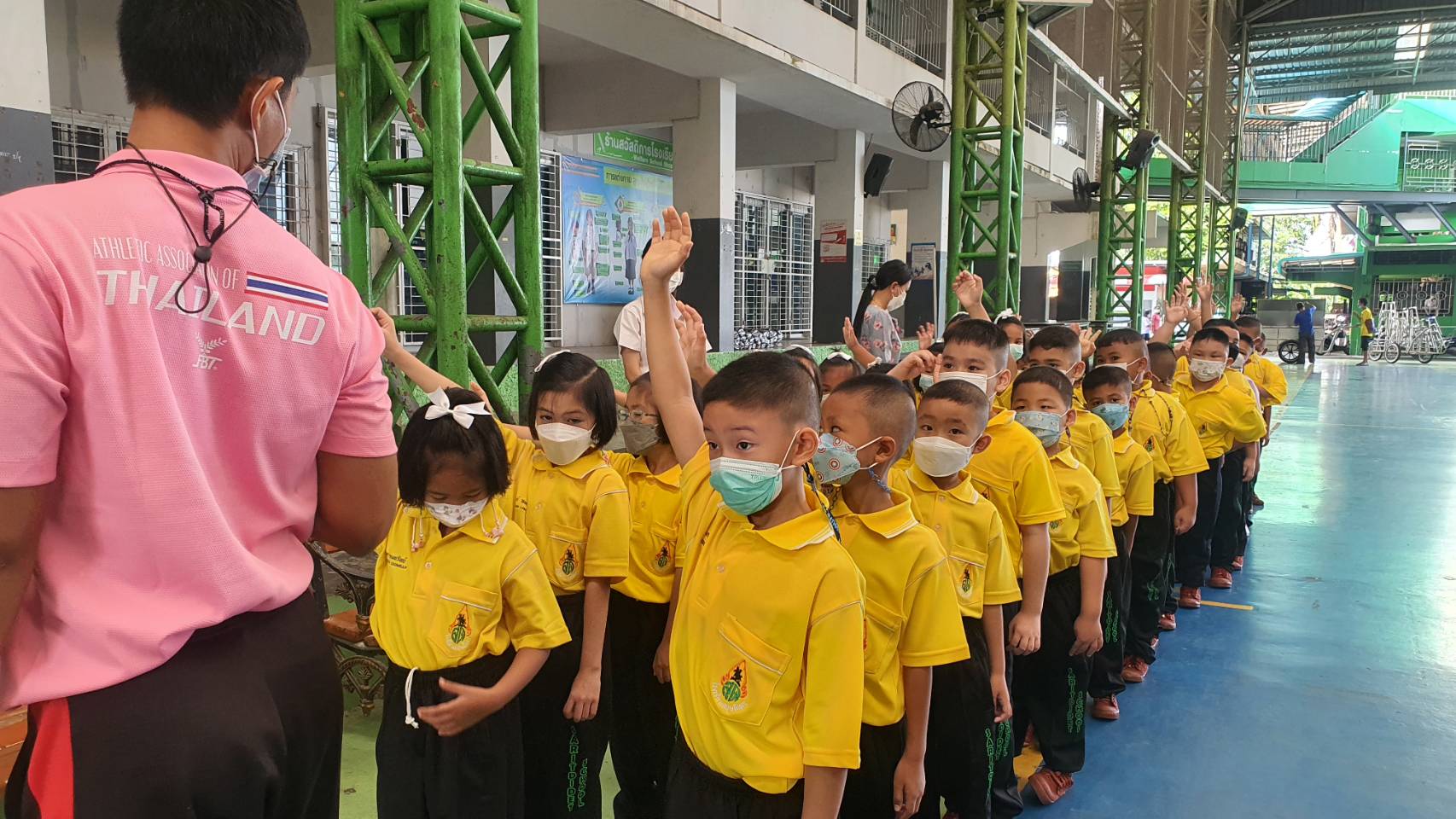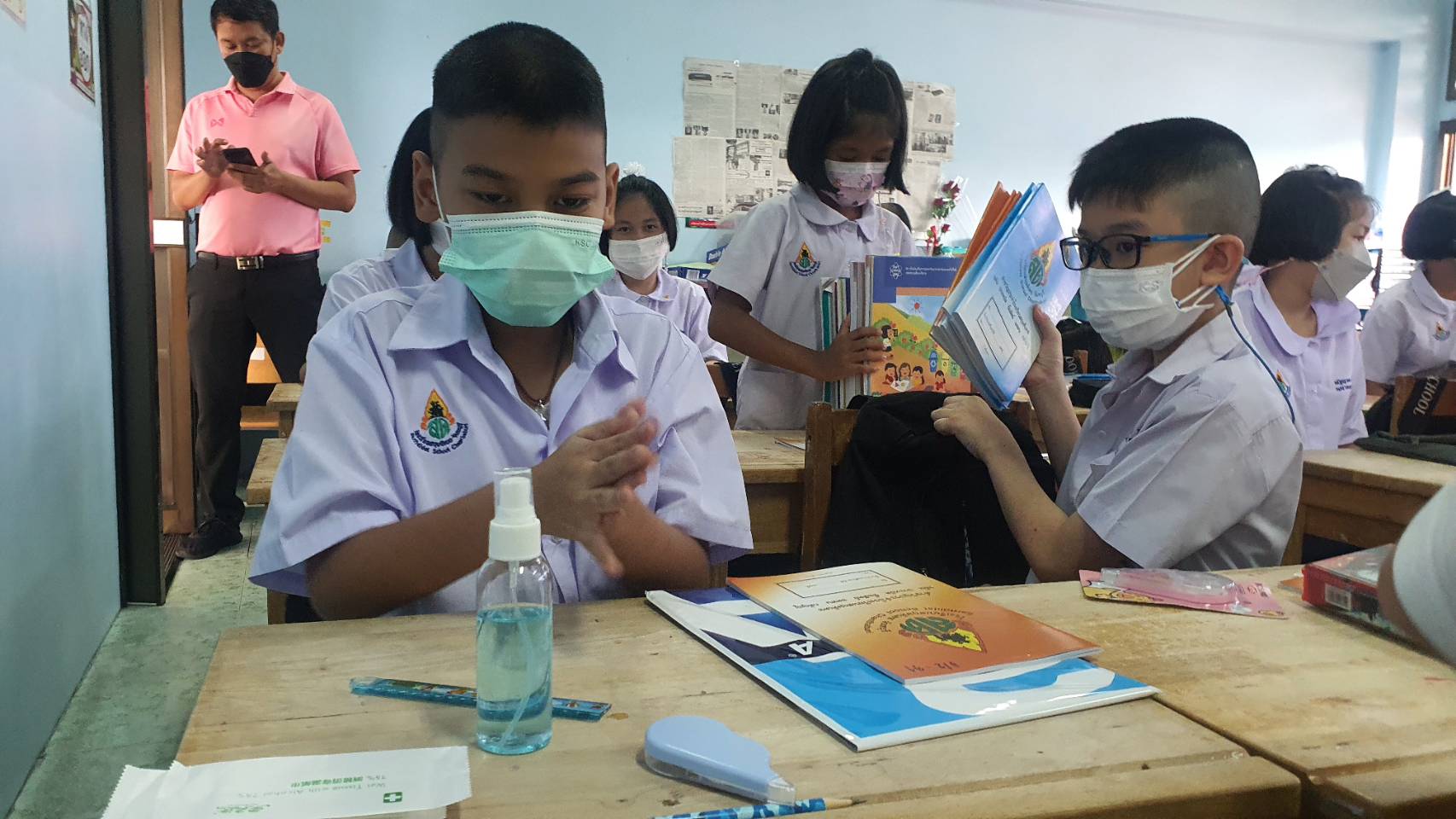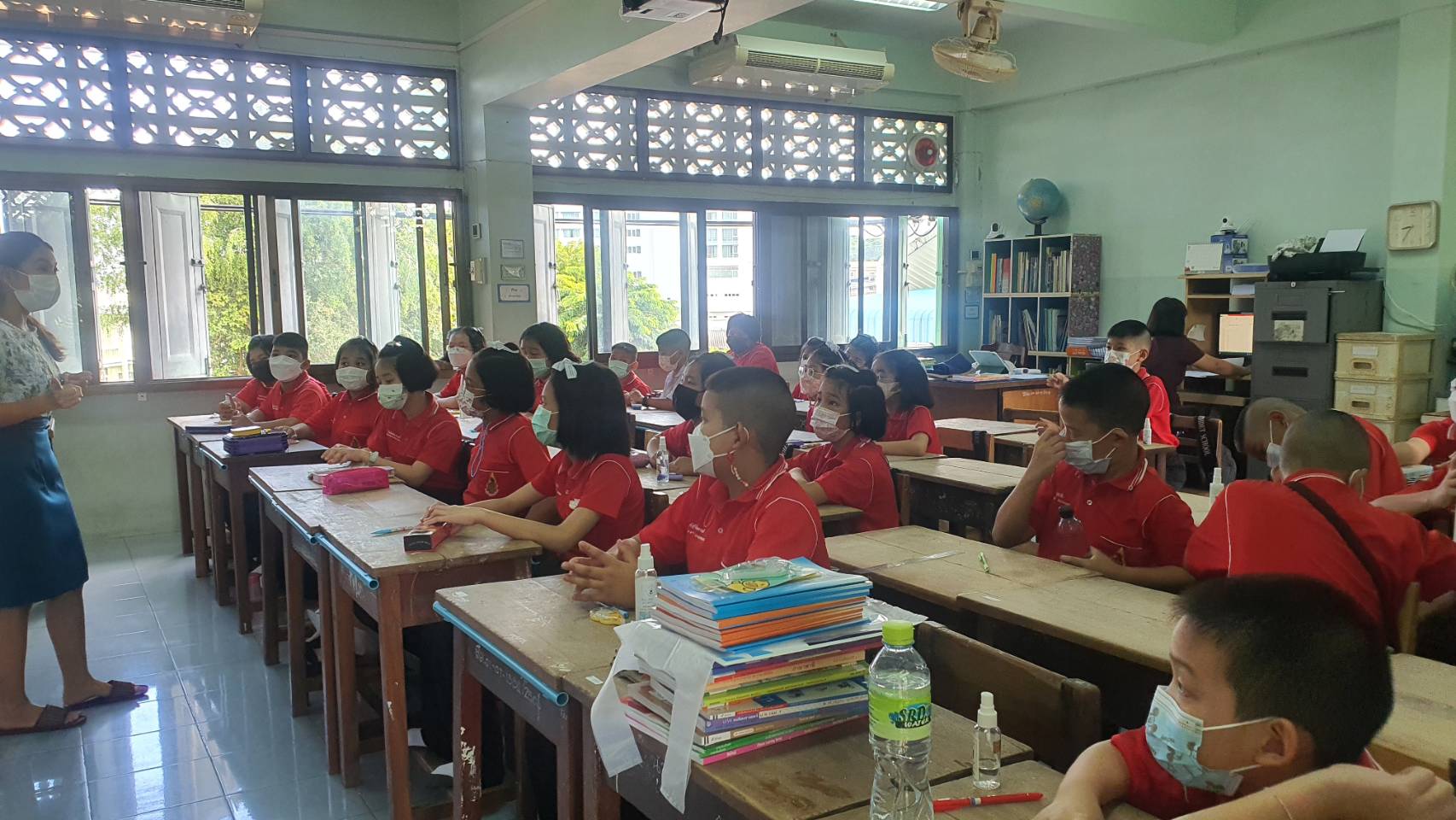 โดยจะมีคุณครูปะกบต่อห้องเรียน 2 คน ทานอาหารในห้องเรียน นำช้อนและแก้วน้ำมาเป็นของส่วนตัว ขณะไปห้องน้ำก็จะเหลื่อมเวลาไม่ให้ชนกันคุณคณูจะดูแลและเป็นคนพาไปเพื่อไม่ให้เด็กแวะเล่นสัมผัสกันกัน ในขณะที่เรื่องการตรวจ ATK ทางโรงเรียนไม่ได้บังคับ แต่ขอความร่วมมือเพื่อให้โรงเรียนปลอดเชื้อ ซึ่งวันนี้มีนักเรียนเพียงไม่กี่คนที่ไม่ได้มา เหตุเพราะเป็นกลุ่มเสี่ยง ดังนั้นจึงมั่นใจได้ว่าลูกหลานที่มาเรียนจะปลอดภัยอย่างแน่นอน แต่ก็เป็นห่วงระหว่างเดินทางมาและกลับจากโรงเรียน ซึ่งอยู่นอกเหนือการดูแลของคุณครู