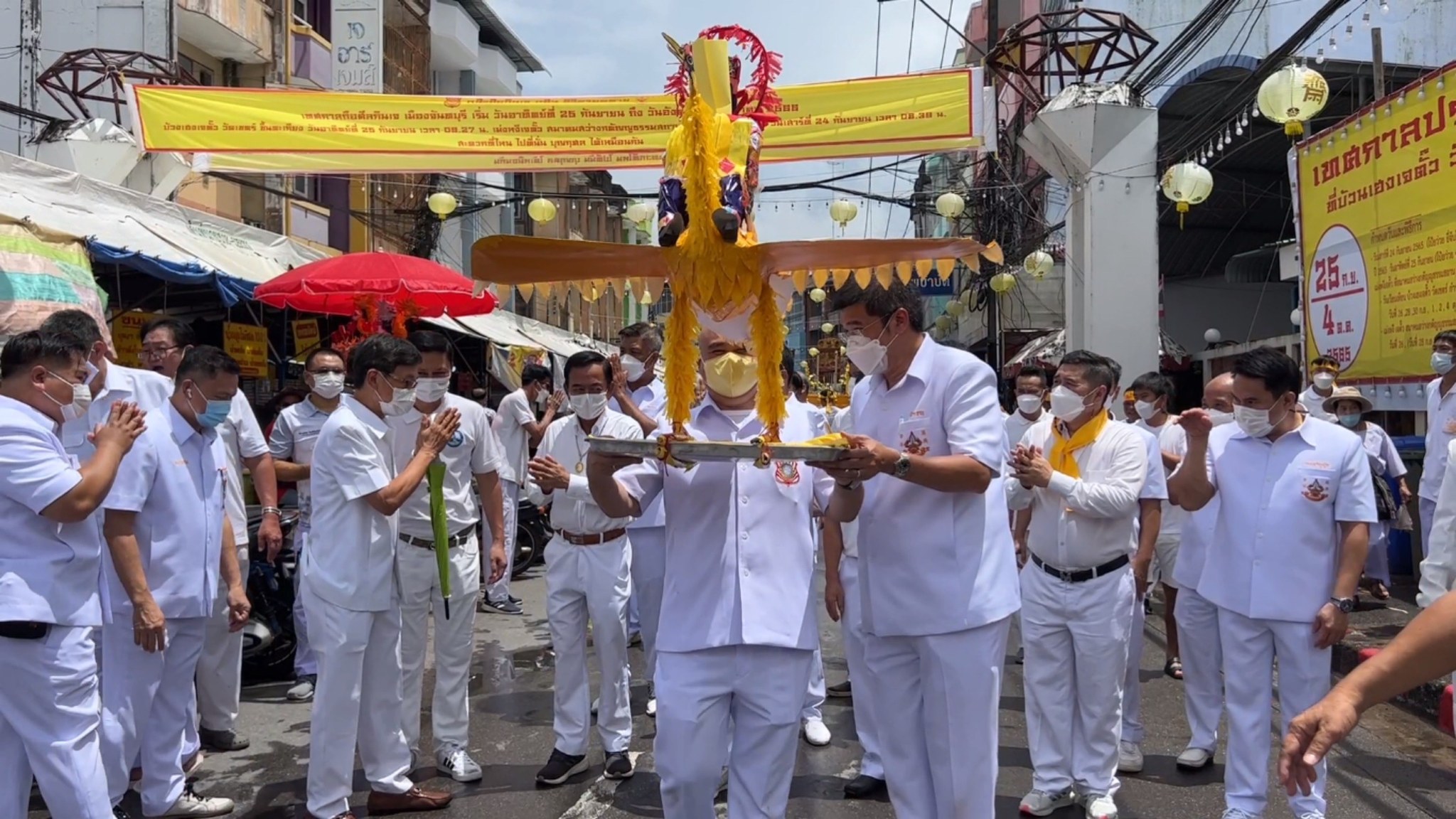 ที่หน้าโรงเจเม่งหงีเจตั๊ว สมาคมสว่างกตัญญูธรรมสถานจันทบุรี นายกานต์พงศ์ ชินอุดมพงศ์ ประธานกรรมการบริหารโรงเจบ้านเฮงเจตั๊ว ได้นำขบวนเกี้ยวองค์เทพ และคณะกรรมการและเหล่าเจอิ๊ว มารับขบวนเกี้ยวจากโรงเจเม่งหงีเจตั๊ว สมาคมสว่างกตัญญูธรรมสถานจันทบุรี นำโดยนายภากร เจียรวิบูลยานนท์ ประธานกรรมการบริหารโรงเจเม่งหงีเจตั๊ว เพื่อไปประกอบพิธีอัญเชิญกิ่วอ้วงฮุกโจ้ว เพื่อมาประดิษฐานเป็นการชั่วคราว ณ โรงเจทั้ง 2 แห่ง ของจังหวัดจันทบุรีเพื่อความเป็นสิริมงคล