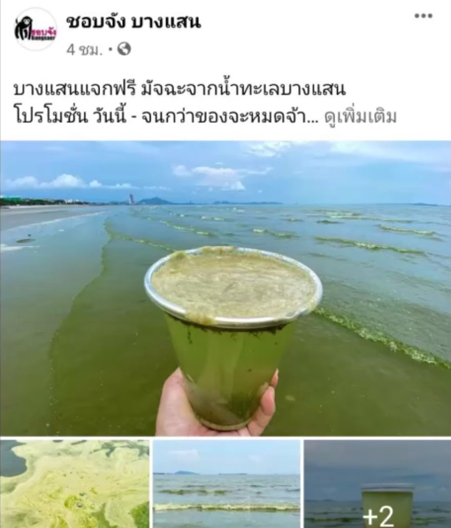 เวลา 06.00น. วันที่ 28 พ.ค.2564 นี่คือเฟสบุ๊คชื่อว่า ชอบจังบางแสน ได้โพสต์รูปภาพของทะเลบางแสนที่มีน้ำสีเขียวเข้มมีฟอง คล้ายน้ำชาเขียว พร้อมข้อความว่า “ บางแสนแจกฟรี มัจฉะจากน้ำทะเลบางแสน โปรโมชั่น วันนี้ – จนกว่าของจะหมดจ้า