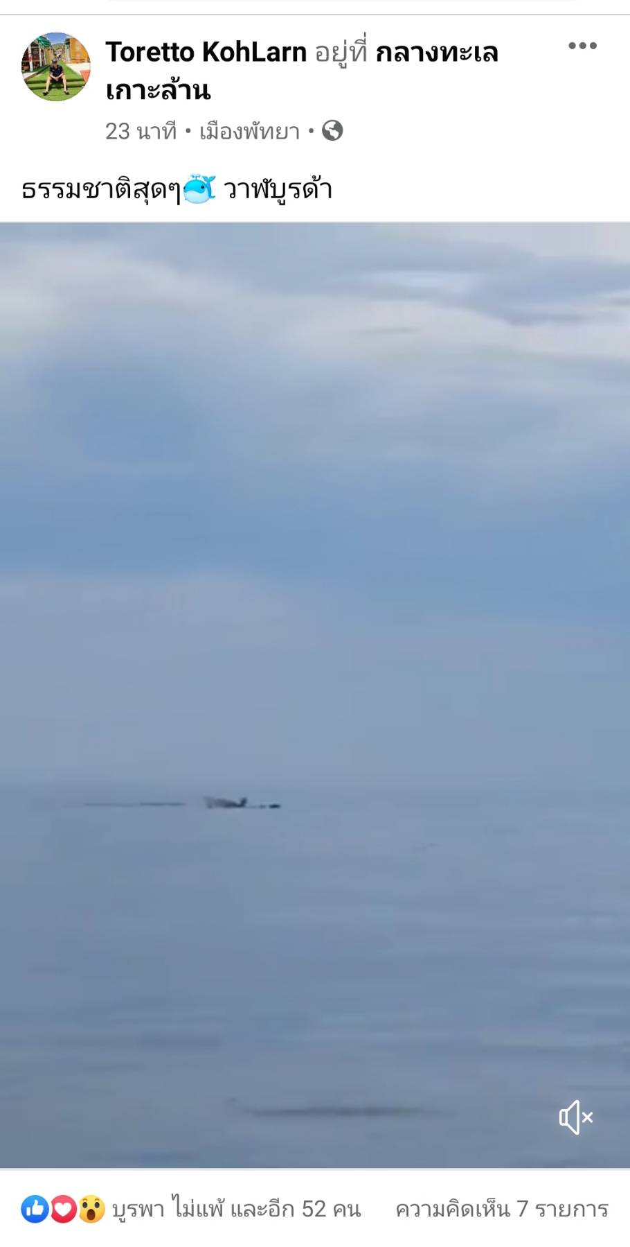 (15ก.คม.64) มีผู้ใช้เฟสบุ๊ค ชื่อ toretto kohlarn ได้โพสต์ข้อความพร้อมภาพวีดีโอ "ธรรมชาติสุดๆวาฬบูรด้า" พร้อมมีเสียงในภาพตื่นเต้นมาก เพราะนานๆครั้งปลาวาฬบูรด้า จะขึ้นมาให้เห็น ทำให้เจ้าตัวตื่นเต้นมากเพราะขึ้นมาเล่นน้ำ 2-3 ตัวกลางอ่าวพัทยา ช่วงพัทยาไปเกาะล้าน