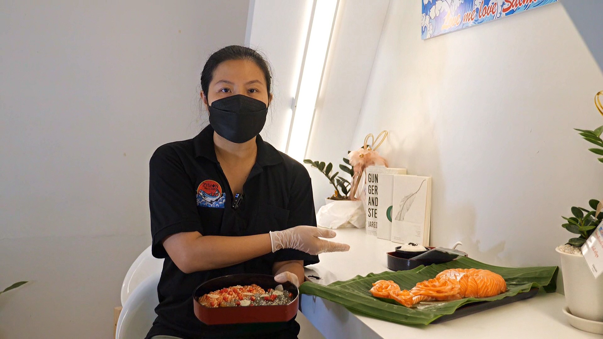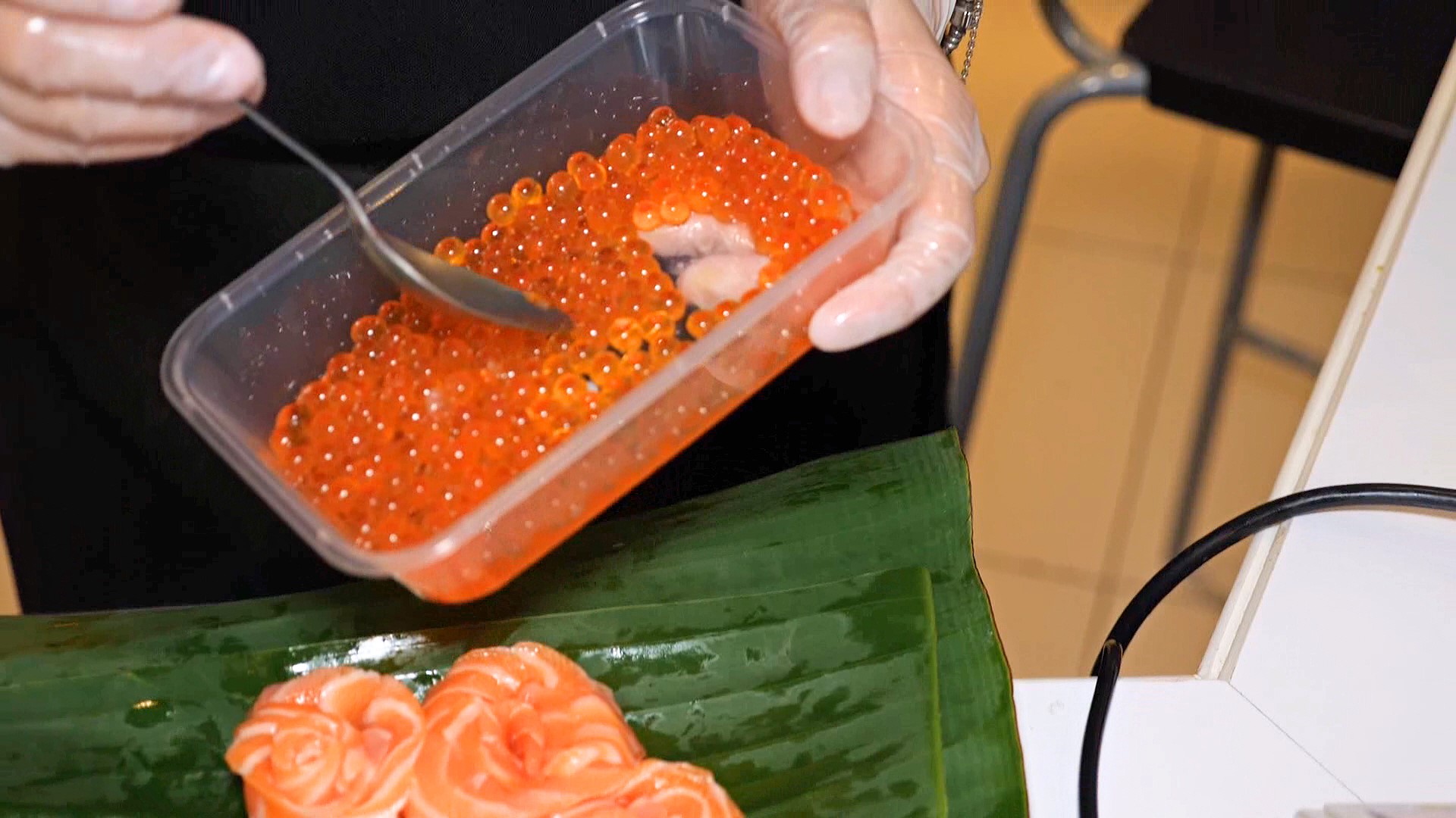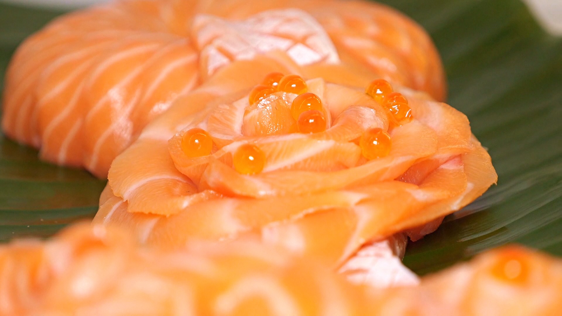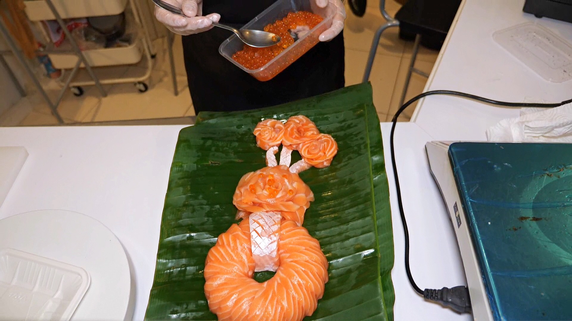 จึงได้ลองปรับวัตถุดิบภายในร้านอาหารญี่ปุ่น มาทำเป็นพวงมาลัยปลาแซลมอน โดยใช้ข้าวญี่ปุ่น ที่ใช้ทำซูชิ มาวางเป็นฐานพวงมาลัย จากนั้นจึงได้นำ เนื้อปลาแซลมอนที่แร่ ตามสไตล์ซูชิ มาวางเรียง ให้ได้สีสัน ของพวงมาลัย เป็นสีส้ม สดใส แทรกด้วยชั้นไขมัน ทำให้ดูน่ารับประทาน นอกจากสีของเนื้อปลาที่เป็นเอกลักษณ์แล้ว ยังนำส่วนท้องปลาแซลมอน มาวางเป็นแนวอุบะ ให้สีขาวละมุน ตัดกับช่อดอกกุหลาบ ที่ประดิษฐ์จากแซลมอนเช่นเดียวกัน